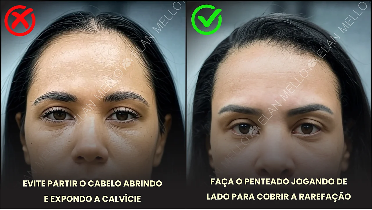 - A mulher que realizar o procedimento deve ter atenção que, quando a rarefação ou falta de cabelo se localizar no topo da cabeça (crânio), em vez de fazer o partido ao meio — o que pode evidenciar ainda mais a área com menos cabelo —, deverá optar por pentear o cabelo para o lado (com partido lateral ou jogado). Essa técnica permite que o cabelo cubra a área com menor densidade, contribuindo para um resultado mais natural que disfarça a calvície ou a falta de cabelo (ver fig. 2).