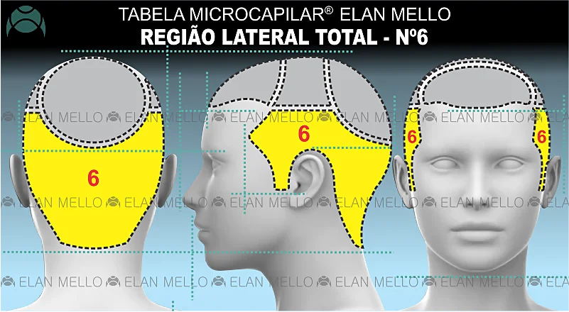 Esse serviço é indicado* para restaurar a densidade em cabelos rarefeitos na Região Lateral Total (nº6 da Tabela Microcapilar® Elan Mello).