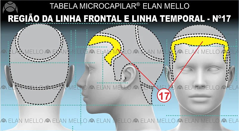 Esse serviço é indicado* para restaurar a densidade em cabelos rarefeitos na Região da Linha Frontal e Linha Temporal (nº17 da Tabela Microcapilar® Elan Mello).